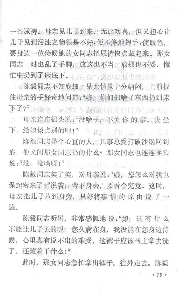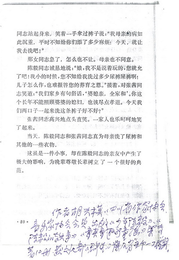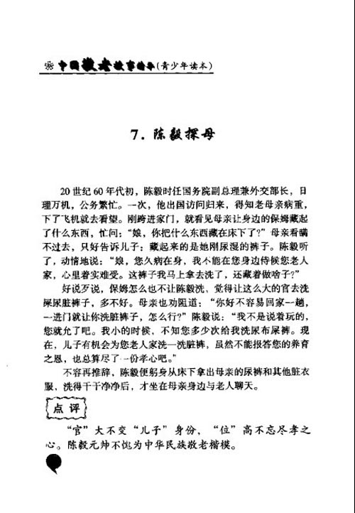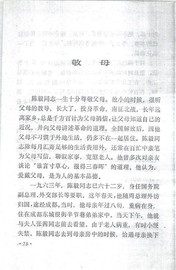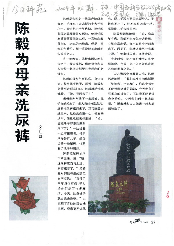 陈毅探望母亲并为母亲洗尿裤的故事广为报刊书籍转载,如:由 原全国政协委员、原民政部副部长李宝库主编,全国老龄工作委员会办公室、中宣部、教育部、共青团中央、全国妇联合开展“全国青少年敬老爱老助老主题教育活动”的推荐读物《中国敬老故事精华》(见附件三)。 《今日科苑》杂志2004年第5期第27页《陈毅为母亲洗尿裤》(见附件四)