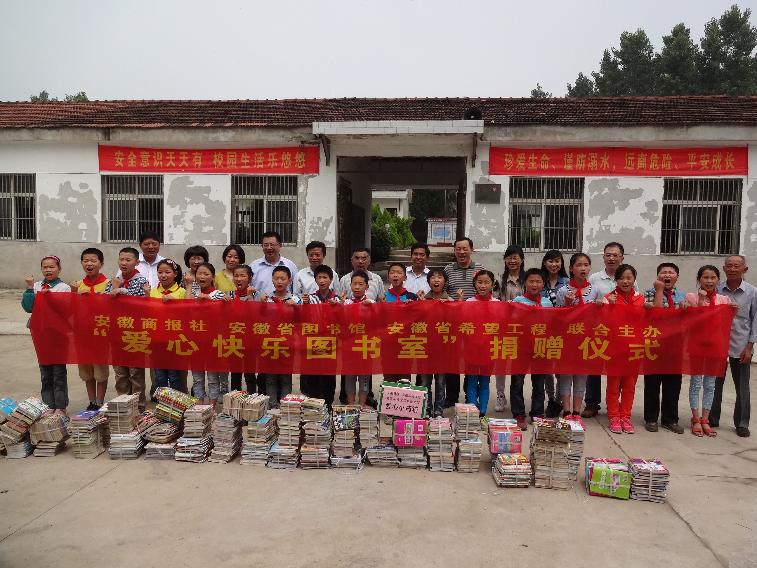 上图为2014年6月17日上午,省图书馆、安徽商报社捐建我乡健康小学“爱心快乐图书室”现场。