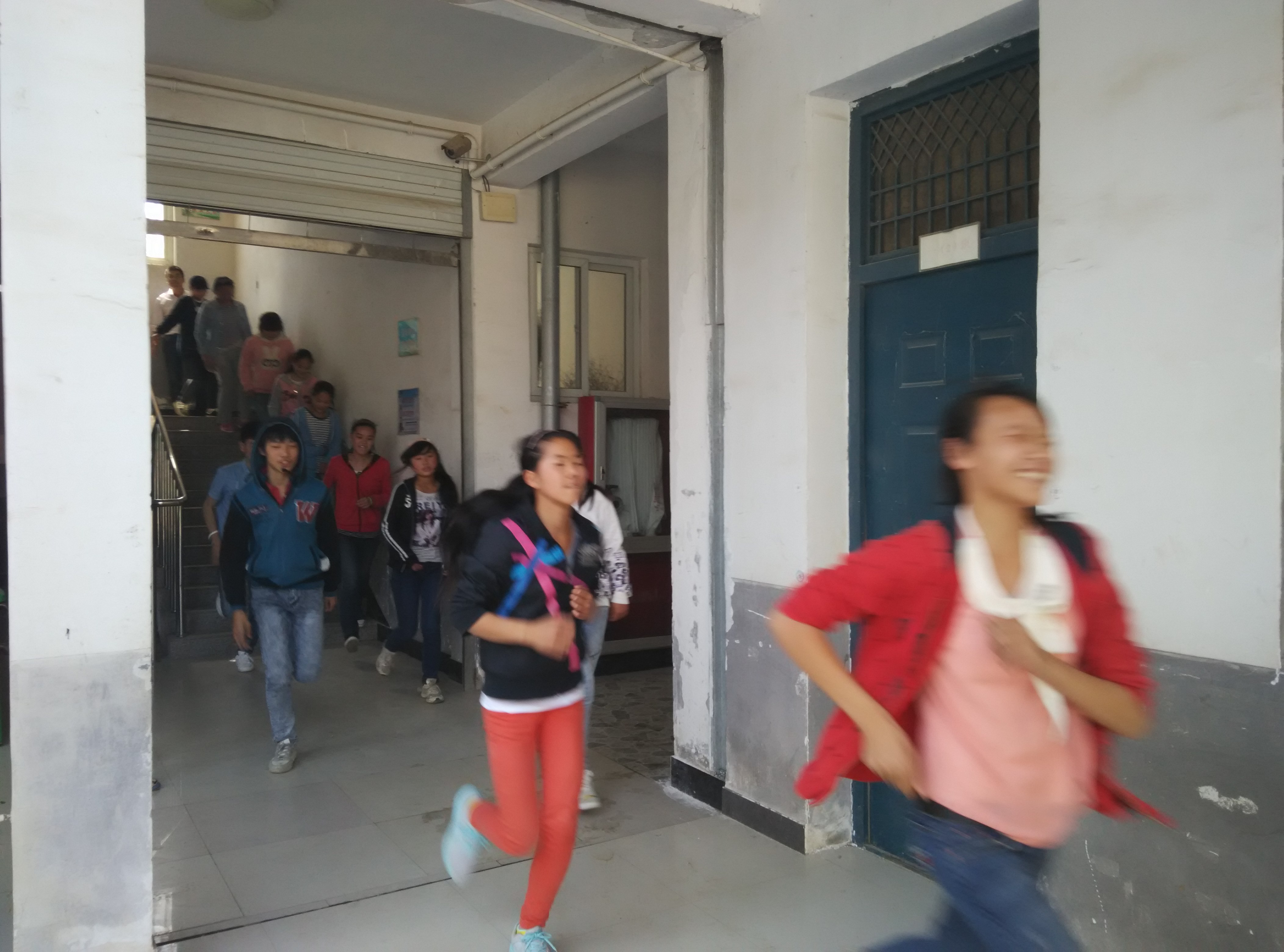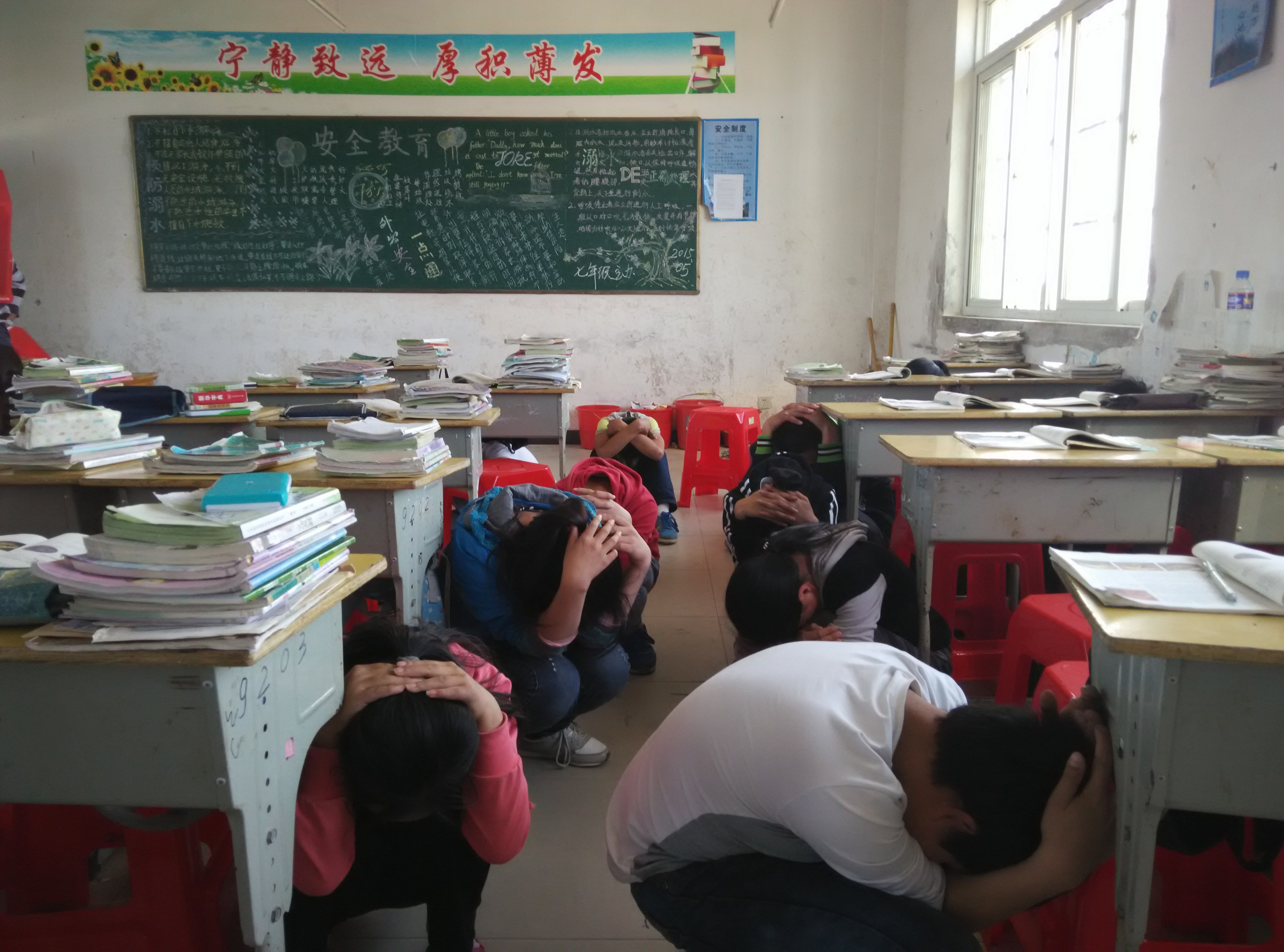 随着刺耳的警报响起,学生们迅速抱头躲避到桌旁安全三角区,负责楼道、楼梯安全的老师和班主任迅速到位,大约一分钟后,在老师的引导下,学生们迅速有序地疏散到学校操场和校门空旷处。