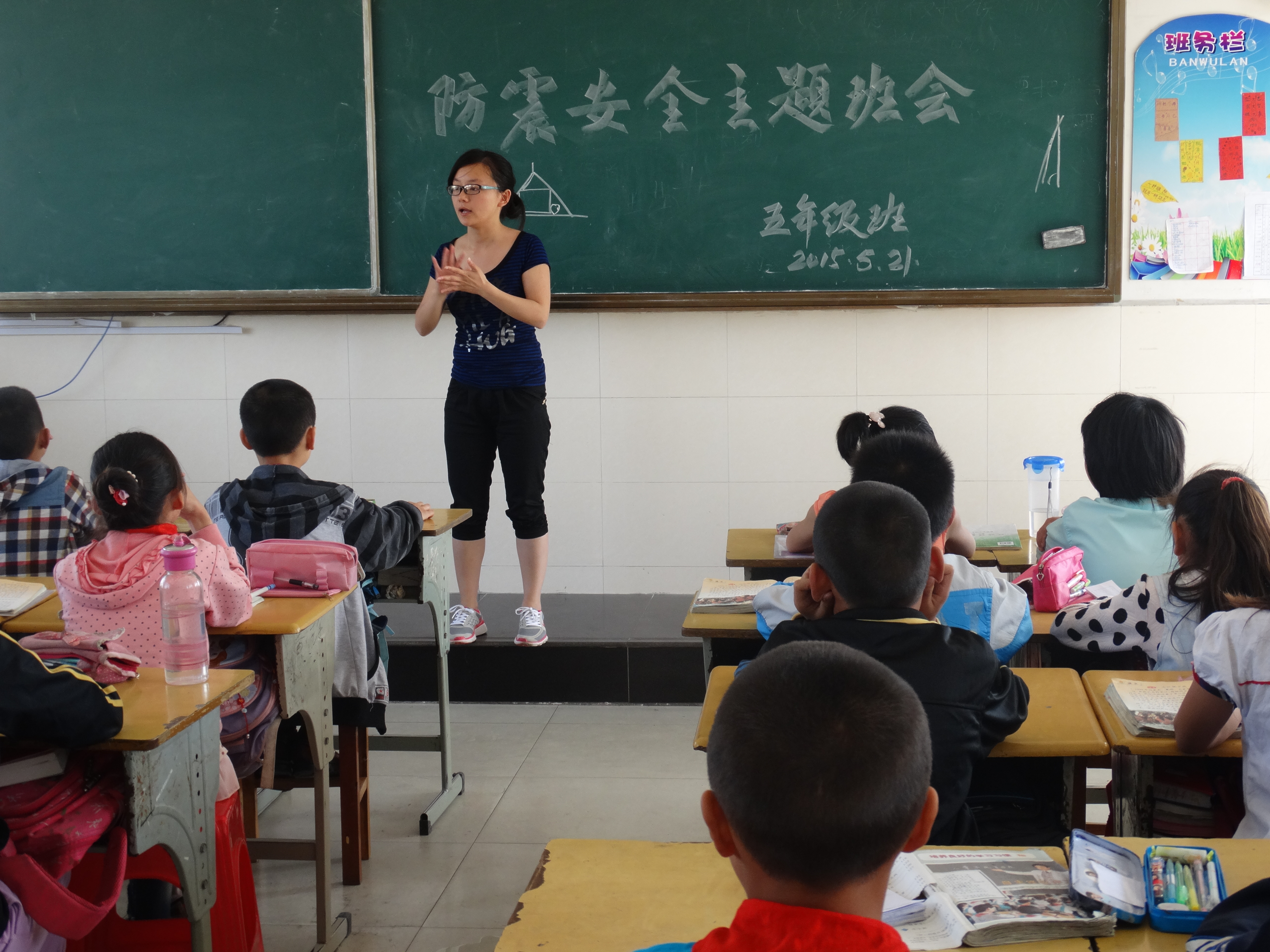 2.上课教师立即停止授课,转而成为教室演练负责人,立即告知学生“地震来了,不要慌”,并指挥学生迅速抱头、闭眼,躲在各自的课桌下或课桌旁,尽量蜷曲身体,降低身体重心,并尽可能用书包保护头部;最后一排靠里的同学面向墙,蹲在墙角处。演练时间为2分钟。