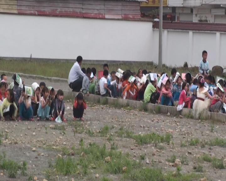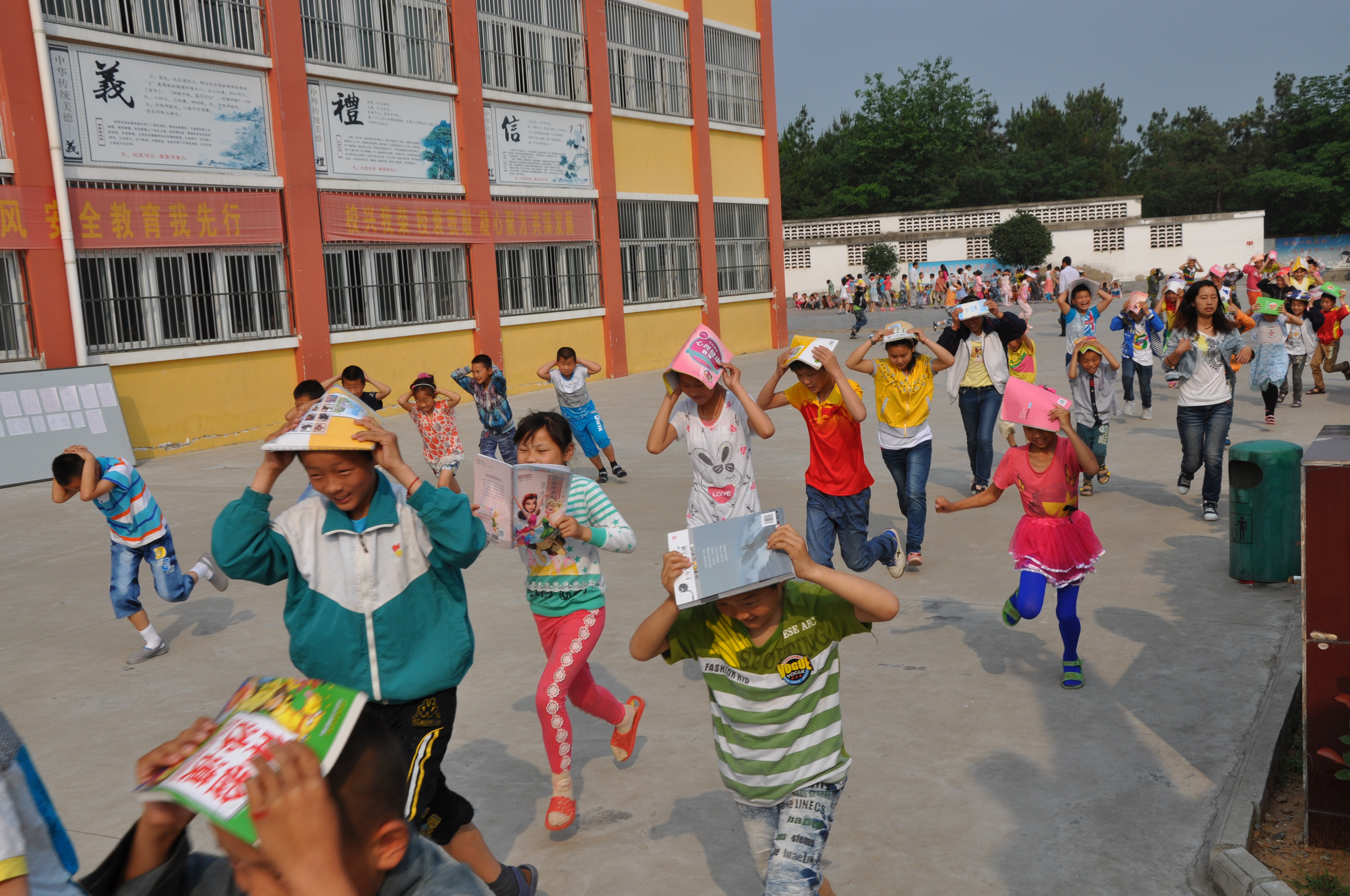 下午3:55分演练警报响起,各楼层的安全员和班主任迅速到位,组织学生就近躲避,学生躲在课桌下,双手抱头,1分钟后,疏散命令下达,学生开始在教师的组织下按照既定的路线有序撤离,撤离过程中,学生能够按照要求保护自己的头部,并注意不推挤和喧哗,跑到学校环形跑道中央。教师清点人数,向总指挥报告。整个演练过程紧张有序,有条不紊,均能做到安全撤离、有序集合,没有发生任何互相推挤或踩踏事故。