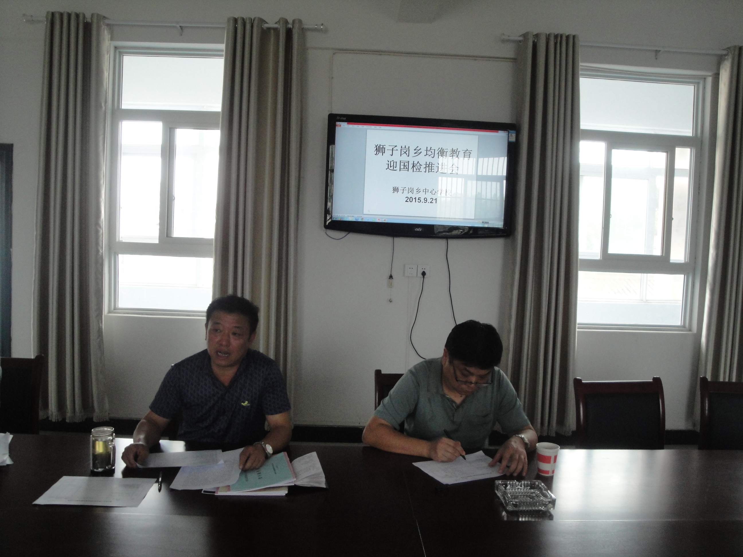 2015年9月21日下午3时,狮子岗乡召开均衡教育迎国检推进会。狮子岗乡中小校长、教务主任和资料员参加会议,区督导办许令智主任参会并指导工作,会议由中心学校校长赵宗杰主持。