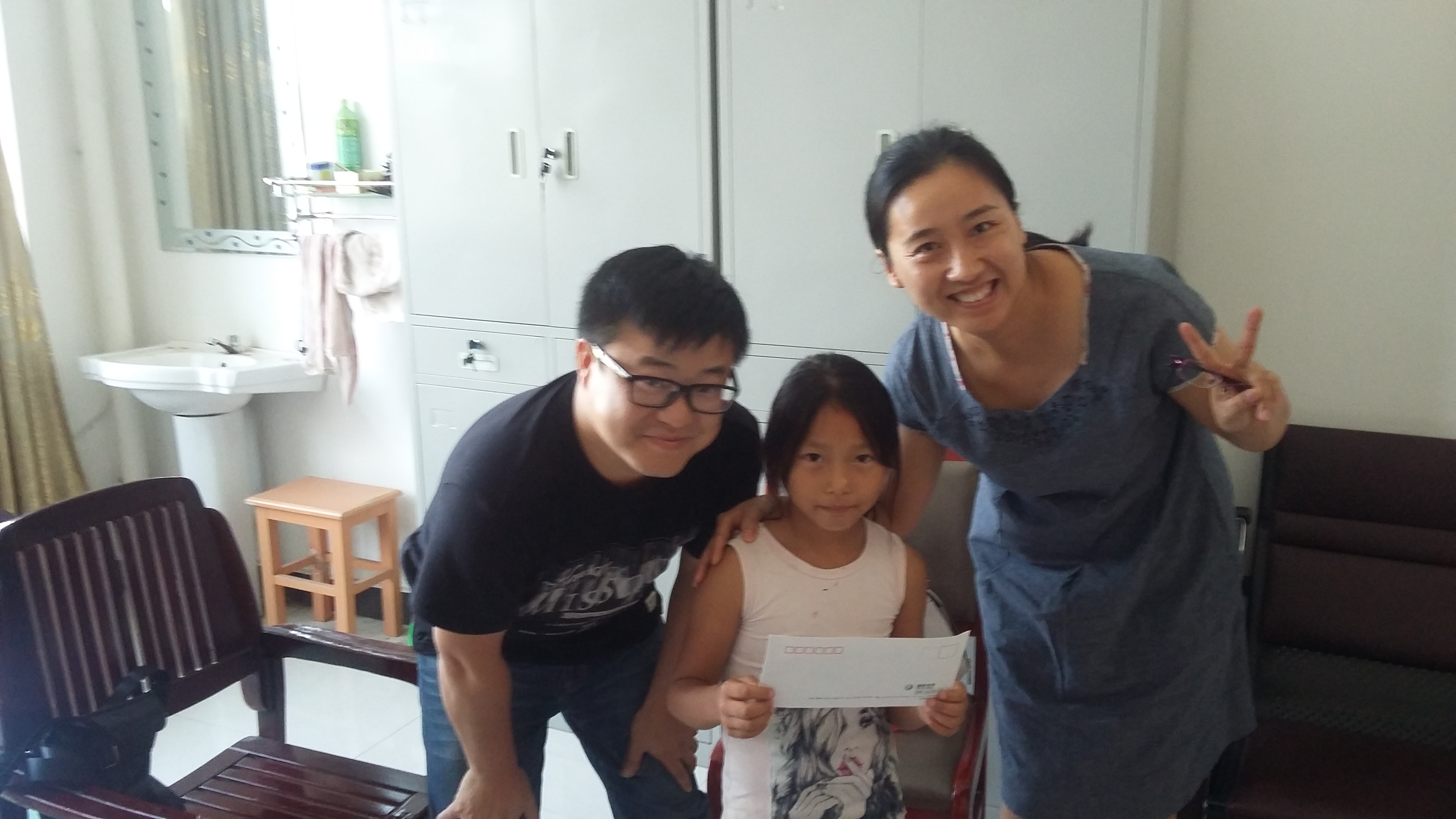 狮子岗乡查婆店小学二(1)班胡美娜同学,俊秀的小脸上洋溢着灿烂的笑容。国网六安供电公司信通分公司党支部书记马玉玲、团支部书记李浩、党员代表陈浩,顶着烈日,来到学校,送上六百元现金,为胡美娜同学解决了购买学习用具和中午就餐的难题。