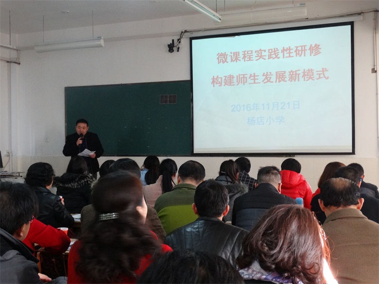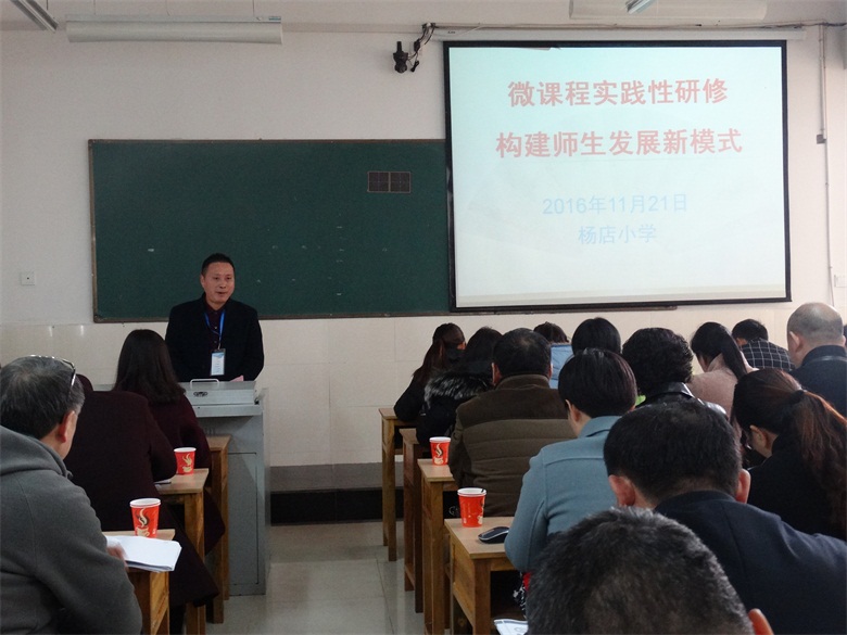 9点50分,所有人聚集到多媒体教室参与“基于微课程的三环六步式网络研修与校本研修整合的混合式培训模式实验项目研修”,杨店小学研修组微课程磨课活动。活动首先由裕安区教师进修学校副校长赵安庆介绍此项研修项目的意义和操作程序,然后我校胡时宝校长就学校基本情况和项目研修过程作了详细的汇报,接着我校16为教师分别展示以学校校本教材《绿色健康游戏》中游戏项目为素材制成的微课,来自我市城区小学的四位专家给予了点评。在长达两个多小时的研磨活动中校长们仔细聆听,认真观看。最后来自上海市嘉定区教师进修学院院长对我校校本课程开发、茶香校园文化建设和绿色健康教育思路给予了高度评价。
