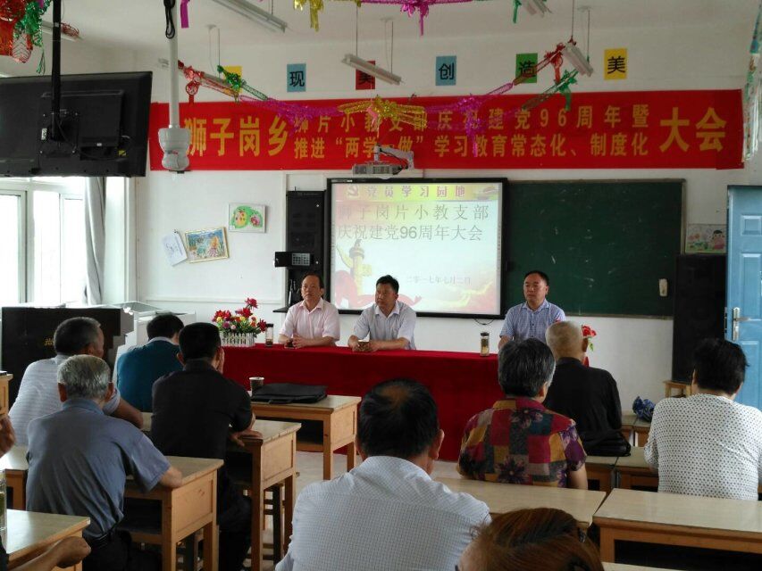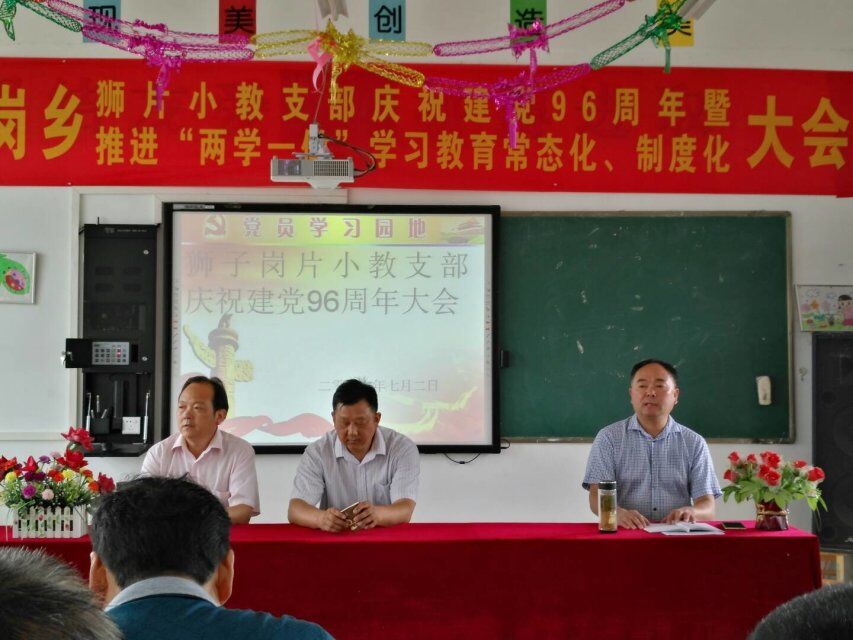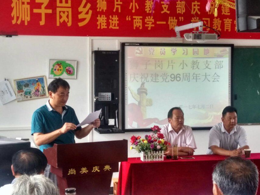 2017年7月2日上午8点30分,狮子岗乡狮片小教支部庆祝建党96周年暨推进“两学一做”学习教育常态化制度化大会在查婆店小学隆重召开。狮子岗乡人大主任刘运林、狮子岗乡教育总支书记赵宗杰、组织委员何世章等应邀参加。该支部39名党员悉数到会。